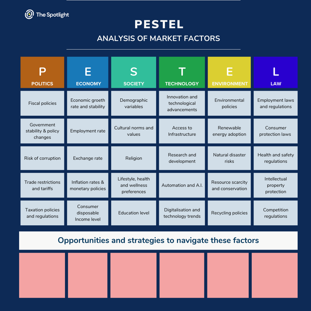 This framework is useful for analysing the external factors that can affect a product's success (such as changes in market conditions, regulatory environments, and consumer behaviour). By conducting a comprehensive analysis of the external environment that can impact a product and its associated business strategy, product and business teams are better able to develop effective strategies to address these factors.