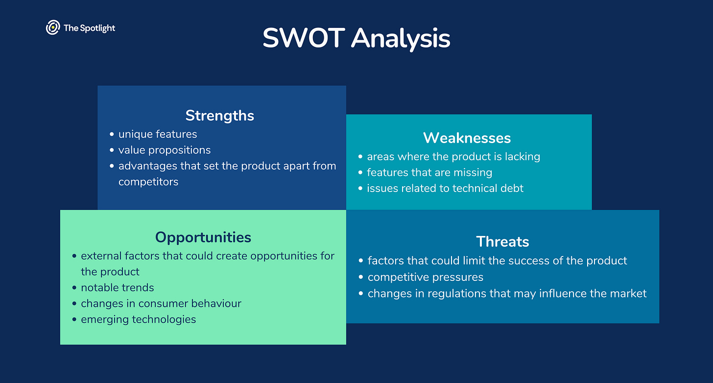 Competitive analysis - A SWOT analysis can be used to identify opportunities and threats in the market in order to better understand the competitive landscape and identify areas where the product can differentiate itself from competitors. By evaluating competitors, product, business and marketing teams can develop competitive strategies that leverage and amplify a products strengths while mitigating its weaknesses.
