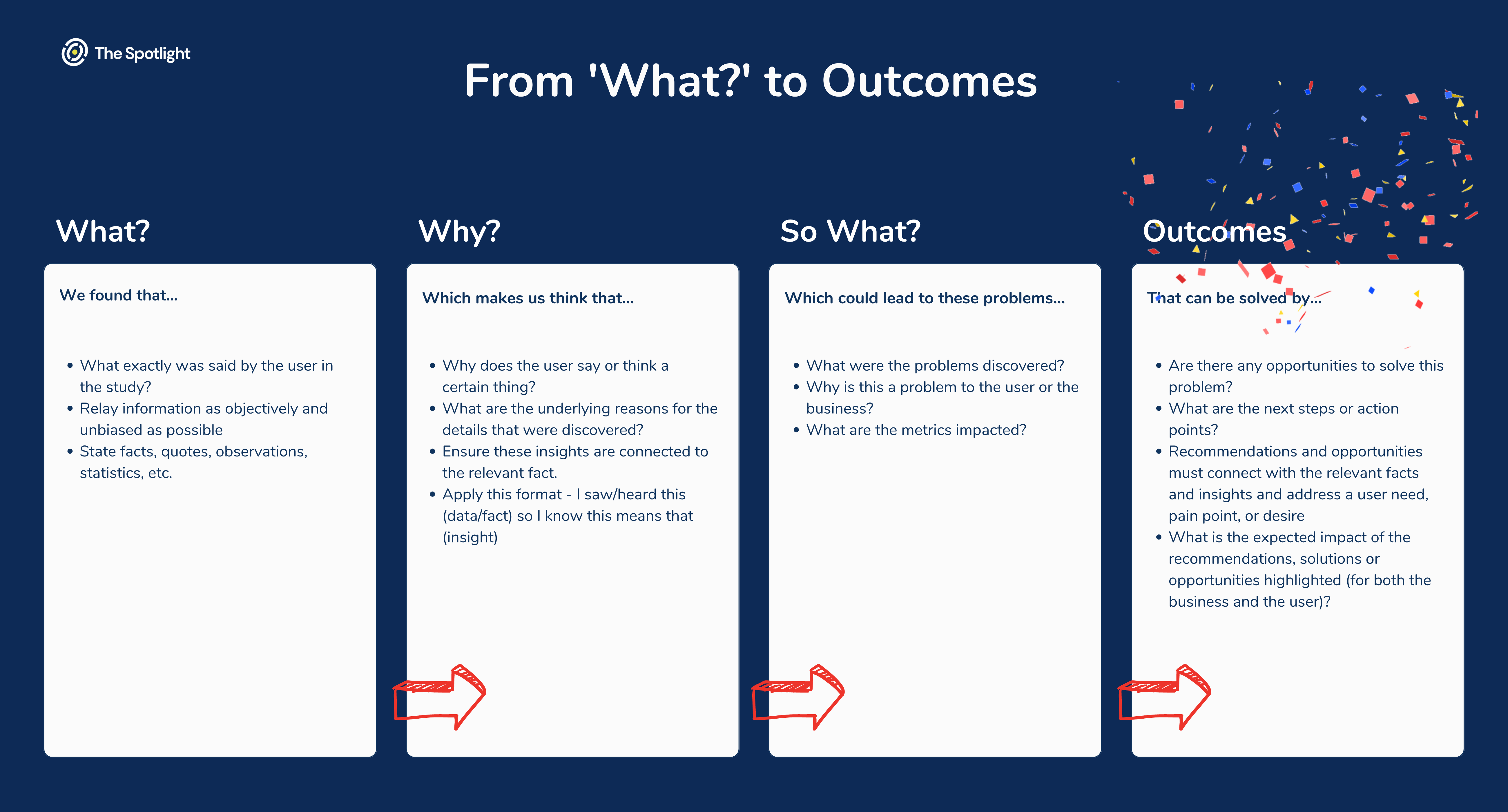 This framework is a great problem solving tool for product teams, as it helps you put your findings through a funnel in order to extract actionable insights.