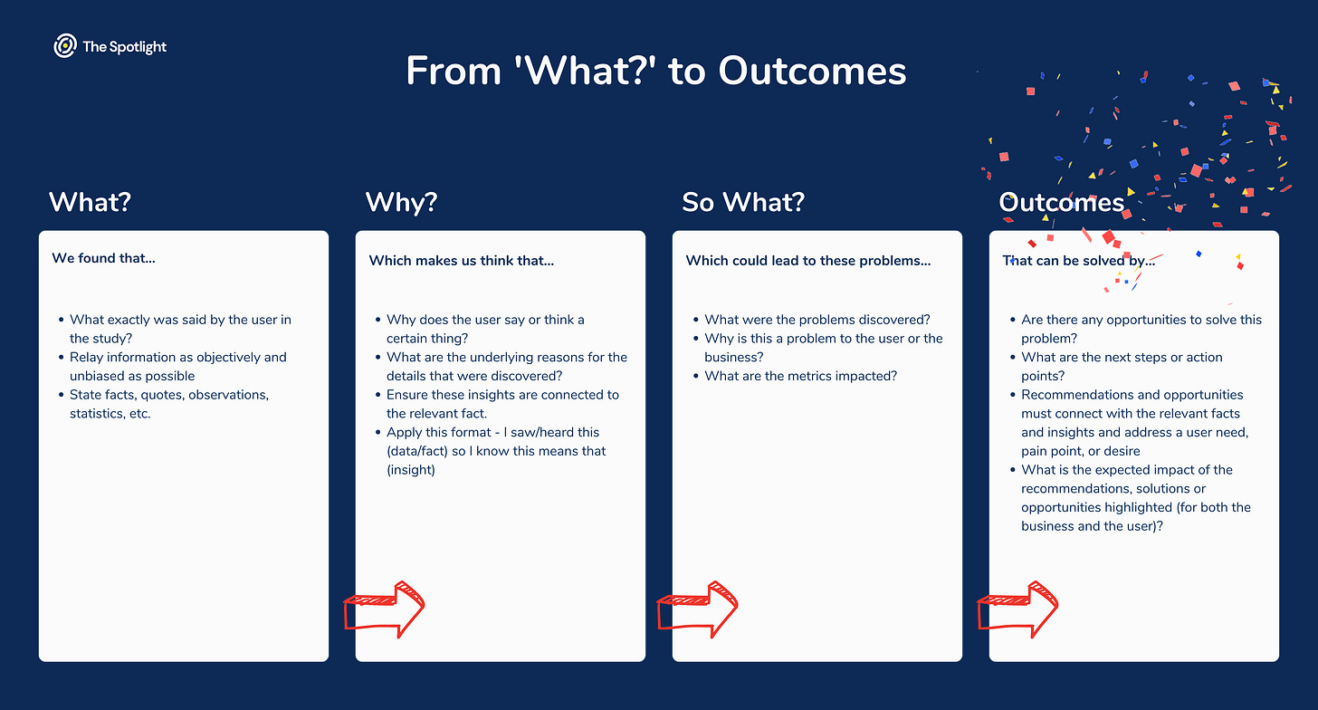 Outcomes - What are the recommended solutions or action points that directly address the user needs/pain points? What is the expected impact of the recommendations, solutions, or opportunities highlighted (for both the business and the user)? This is a great way to communicate to your stakeholders why it is important to solve the problems you have identified.